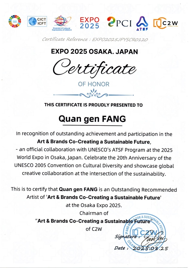 2025年5月22日让方全根艺术走向世界走进大阪世博世界最大IP,全球最大流量,打造艺术国际影响力1、组委会统一制作宣传画面2、大阪世博会Team Expo官方馆内艺术展区以LED屏幕宣传形式滚动播放3天。颁发参展证书。