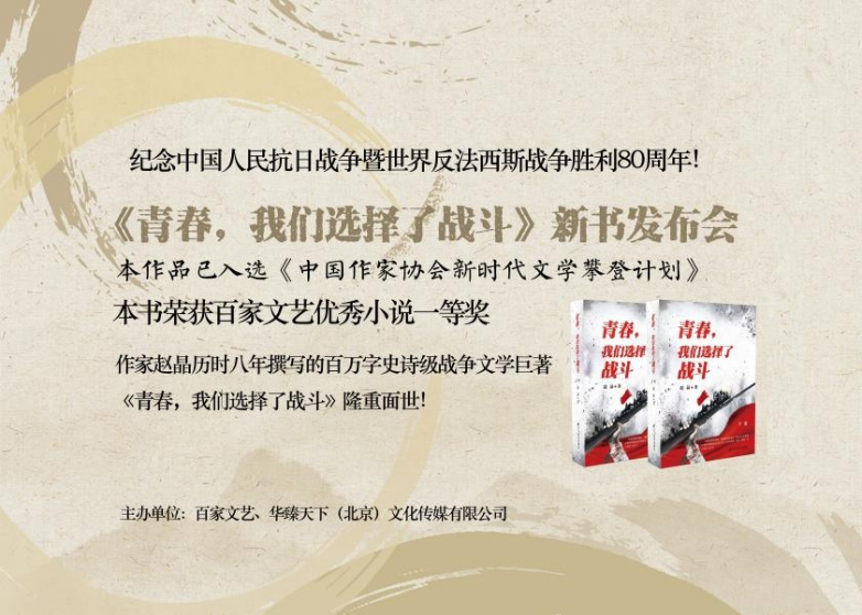 2025 年,是中国人民抗日战争胜利暨世界反法西斯战争胜利 80 周年。当历史的硝烟渐渐散去,总有一些故事值得被永远铭记,总有一种精神需要代代传承。由湖南知名作家赵晶历时八年创作,辽宁教育出版社精心打造的百万字长篇小说《青春,我们选择了战斗》,正是这样一部为纪念而生、为信仰而书的文学巨著——它以浓重的笔墨重现抗战岁月,用青年群像唤醒民族记忆,让每一位读者在字里行间触摸到那个年代最炽热的青春与最坚定的家国情怀。